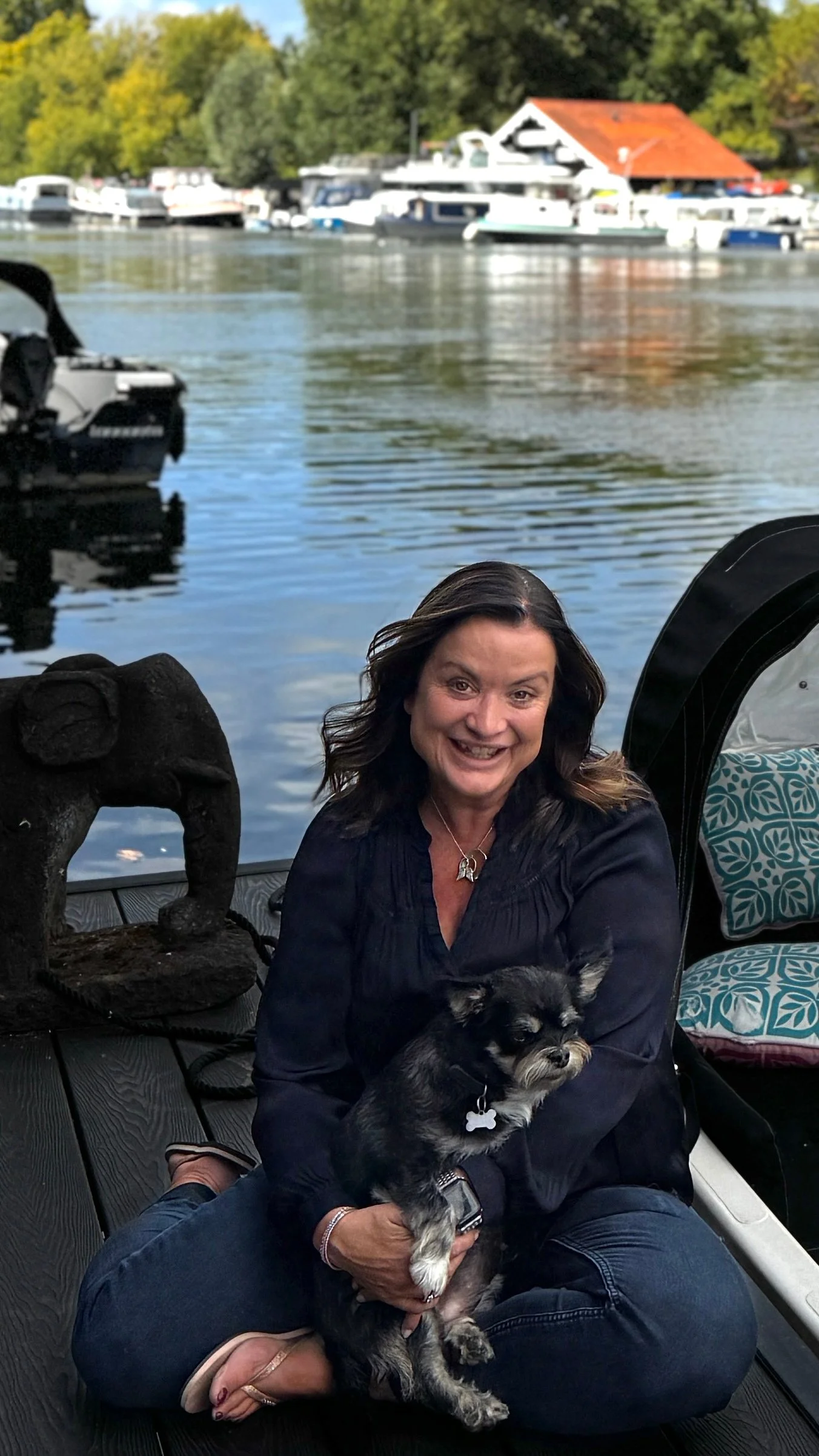 I am live on the river on a houseboat that we built with my little dog, Gigi (pictured) and my incredible partner (not pictured)